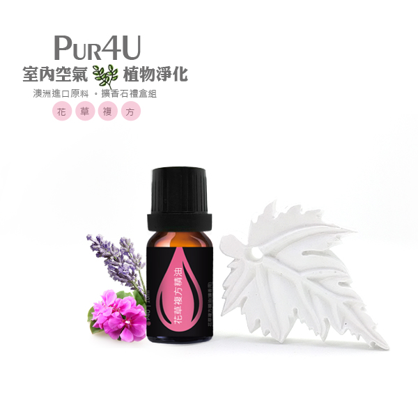 花草複方: 玫瑰香茅精油、玫瑰天竺葵精油、薰衣草精油、檸檬草精油。