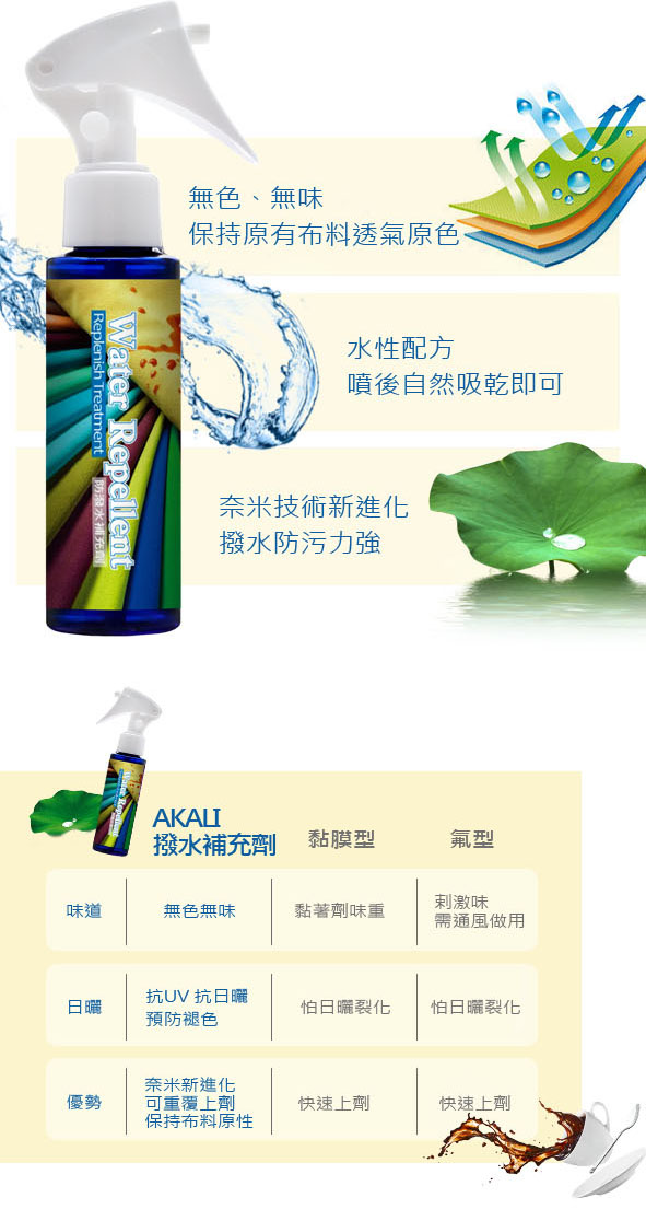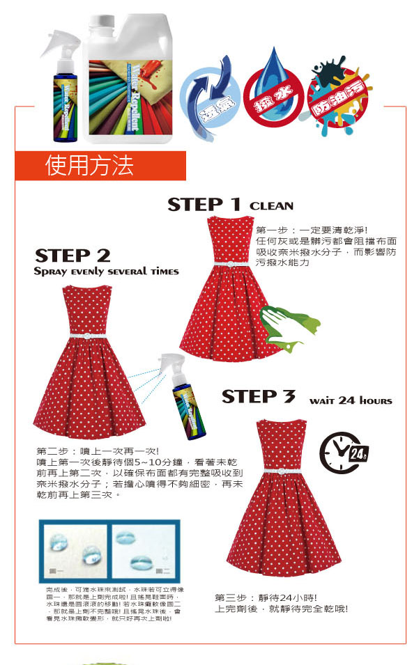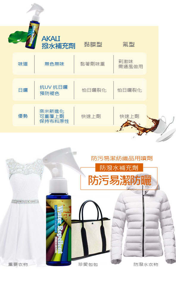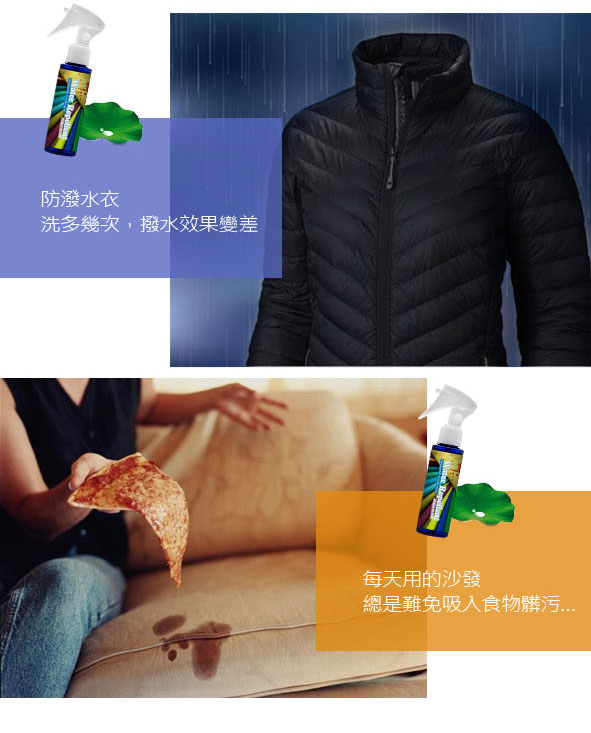 奈米新配方 避免產生斑點或色斑 品牌包包 外套保養 防潑水防污易潔髒污不吸入異味不黏入不怕食物潑灑 適用於各式吸水性家用布藝飾品窗簾沙發 仍保持原有布料透氣物性 、延長防水服飾或裝備機能功能性