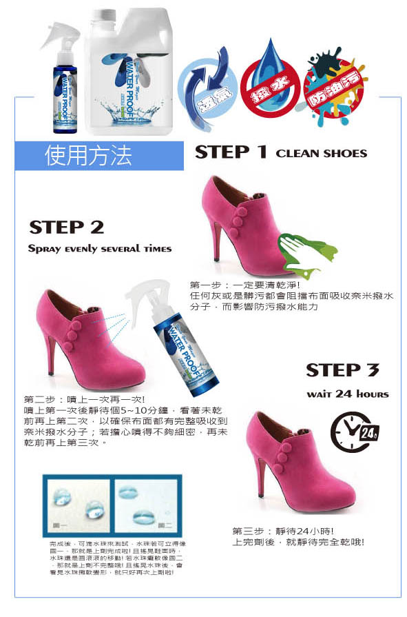 預先將要鞋面清潔乾淨,並盡量保持鞋面平躺的方式上劑,噴劑上下搖晃均勻後,來回噴灑1-3次,看到表面大約微濕,此時可用細毛刷(例如牙刷)將溶劑刷勻,如果是麂皮類絨毛面,可繞圓方式來回刷入,使溶劑可均勻被吸入表面,再靜待24小時自然風乾後即可;待上劑完成後,可用手灑水測試,如果此時水呈現圓形立珠不平躺,即是上劑完整,若不,可重覆上劑。